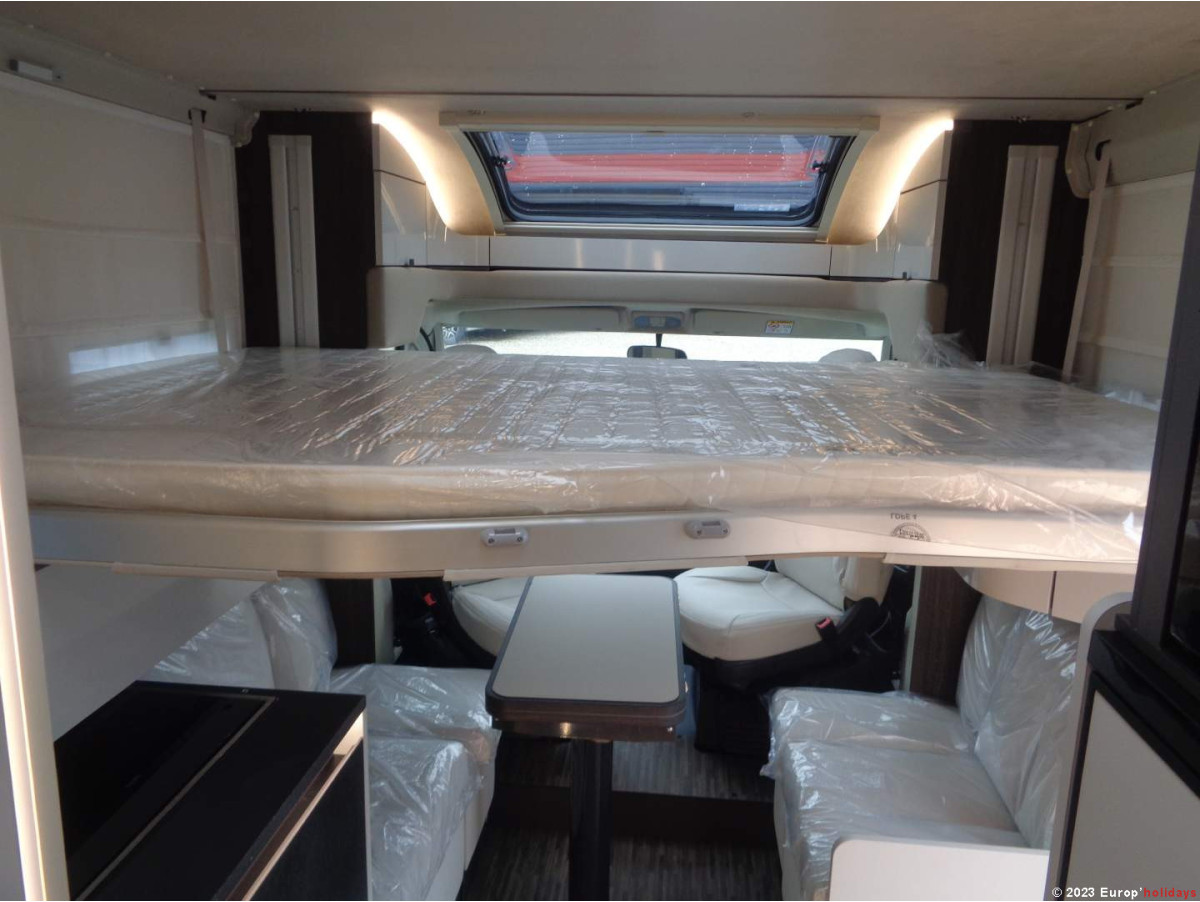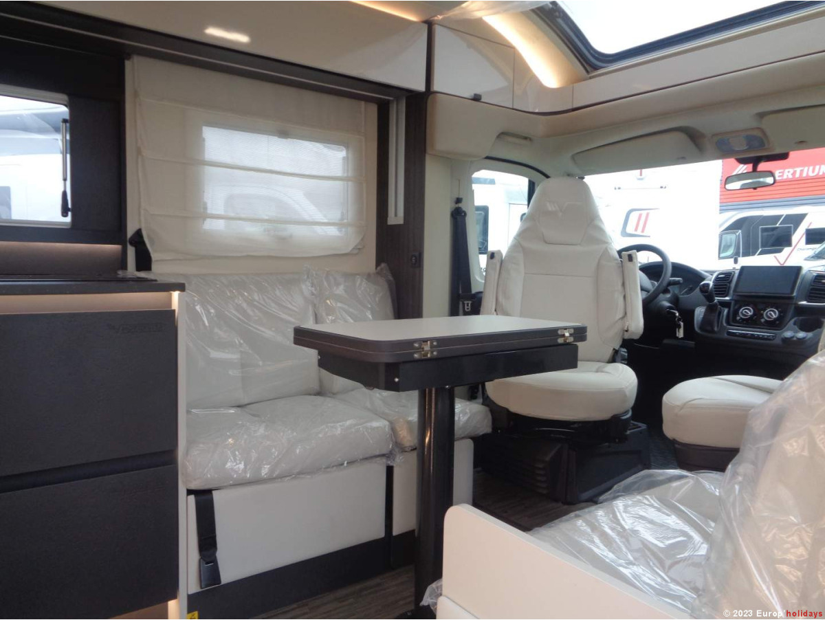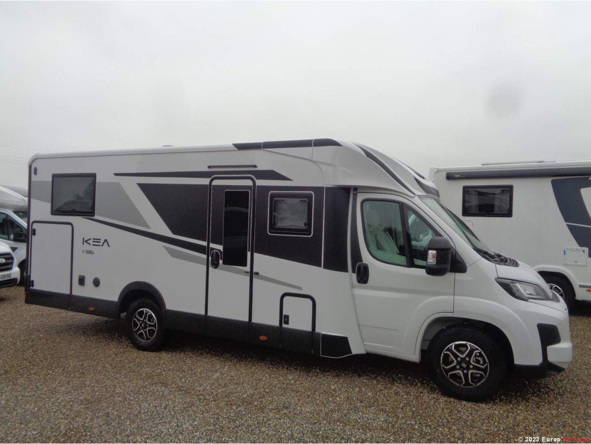 Der Mobilvetta Kea P 86 ist endlich da: teilintegriertes Wohnmobil mit Einzelbetten und elektrischem Hubbett, Face-to-Face-Sitzgruppe und großer Heckgarage.